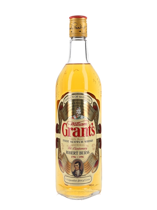 A bottle of Grant's Family Reserve 1996 Finest Scotch Whisky Scotch whisky. This was bottled to comemorate the Bi-Centenary of Robert Burns 1796-1996.