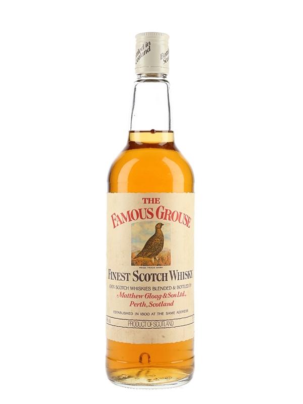 A bottle of The Famous Grouse Finest Scotch Whisky, blended and bottled by Matthew Gloag & Son Ltd. We estimate this was bottled in the 1980s.