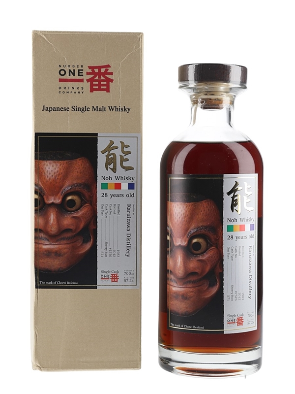 A bottle of Karuizawa 28 Year Old Japanese Single Malt Whisky from the Noh series. This was distilled in 1983, matured in a single sherry butt and bottled in 2012 by Number One Drinks Company.