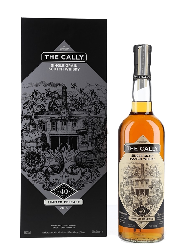 A bottle of The Cally 40 Year Old Single Grain Scotch Whisky. This was distilled in 1974 at The Caledonian Distillery and bottled at a cask strength of 53.3% ABV in 2015.
