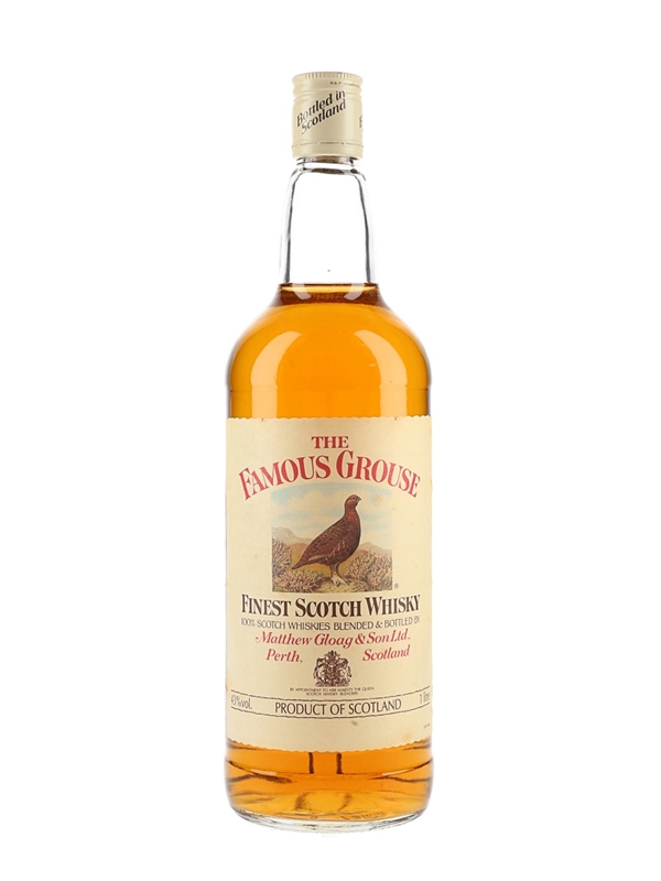 A litre bottle of The Famous Grouse Finest Scotch Whisky, produced by Matthew Gloag & Son Ltd. We estimate this was bottled in the 1980s.