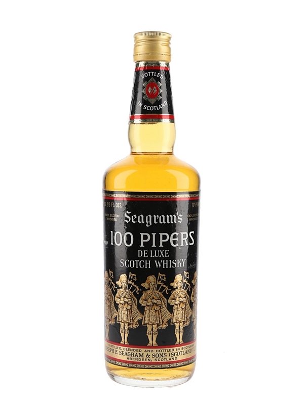 A bottle of Seagram's 100 Pipers De Luxe Scotch whisky. We estimate this was bottled in the 1970s.