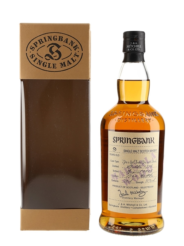 A bottle of Springbank 9 Year Old Single Malt Scotch Whisky. This was distilled in October 1996, matured for seven years in refill bourbon casks before a finishing period of two years in fresh Marsala casks and bottled at 58% ABV in August 2006.