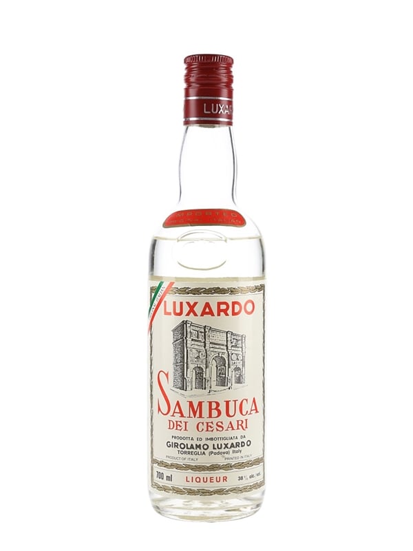 A bottle of Luxardo Sambuca Dei Cesari liqueur produced in Italy.