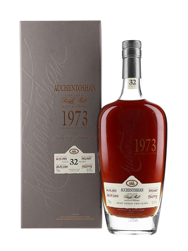 A bottle of Auchentoshan 32 Year Old Lowland Single Malt Scotch Whisky. This was distilled on 14 March 1973, matured for 32 years in two Spanish sherry casks and bottled on 8 July 2005 at a cask strength of 55.5% ABV.