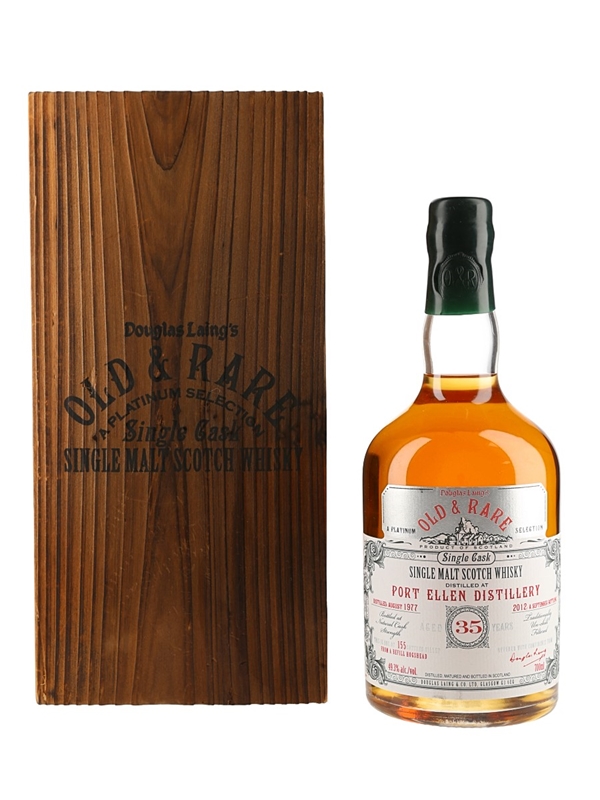 A bottle of Port Ellen 35 Year Old Single Malt Scotch Whisky. This was distilled in 1977, matured in a refill hogshead and bottled at natural cask strength in September 2012. This is bottle number 113 of 155.