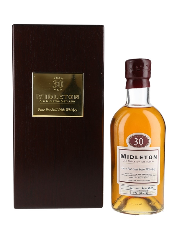 A bottle of Midleton 30 Year Old Pure Pot Still Irish Whiskey. This was distilled in 1969 and matured for 30 years before bottling. This comes in a lockable presentation box.
