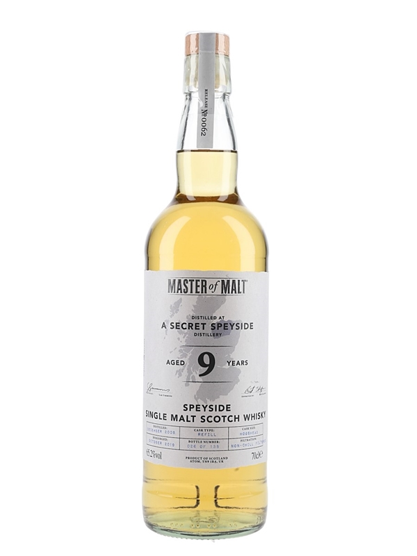 A bottle of A Secret Speyside 9 Year Old Single Malt Scotch Whisky. This was distilled in December 2009, matured in a Refill hogshead and bottled in October 2019 by Master of Malt.