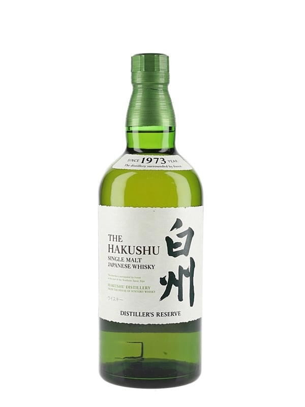 A bottle of Hakushu Distiller's Reserve Single Malt Whisky, first released in 2014 at the same time as the Yamazaki Distiller's Reserve. This was imported by Beam Suntory Ltd.