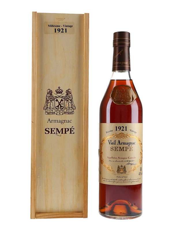 A bottle of Vieil Armagnac Sempé 1921 presented in a box and bottled in 2011.