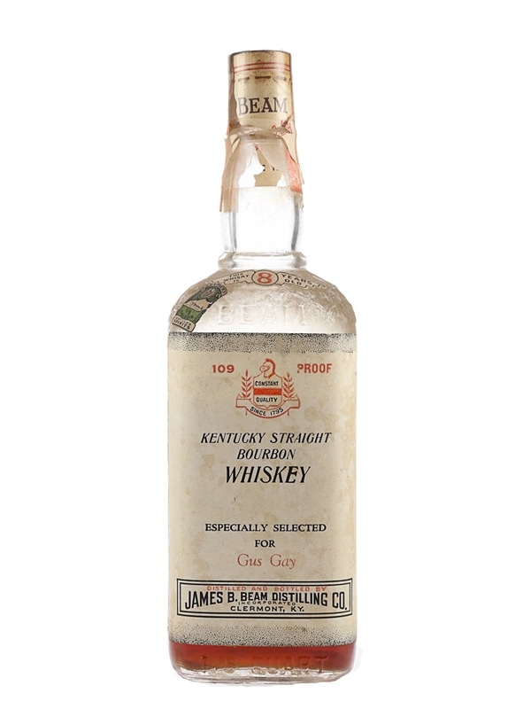A bottle of Jim Beam 8 Year Old 109 Proof Kentucky Straight Bourbon Whiskey specially selected for Gus Gay. We estimate this was bottled in the late 1940s to 1950s.