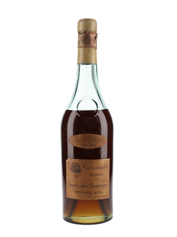 A bottle of Pinet Castillon & Co. 1920 Grande Fine Champagne Cognac. We estimate this was bottled in the 1940s to 11950s.