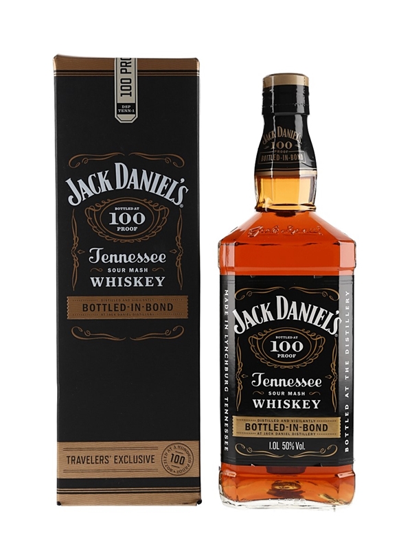 A litre bottle of Jack Daniel's Tennessee whiskey, bottled in bond at 50% ABV. This was bottled for the travel retail market.