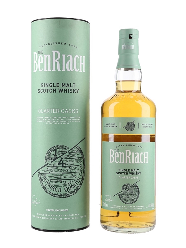 A bottle of Benriach Quarter Casks Single Malt Scotch Whisky, matured in Quarter casks for more intense maturation. The bottling code indicates this was bottled on 08 October 2018.