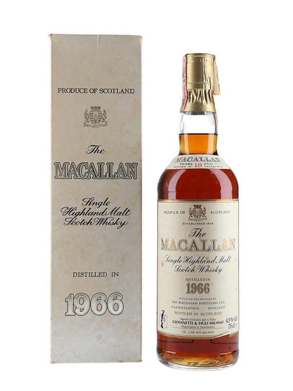 A bottle of The Macallan 18 Year Old Single Highland Malt Scotch Whisky, distilled in 1966 and matured in sherry casks. This was imported to the Italian market by Giovinetti, we estimate this was bottled in the 1980s.