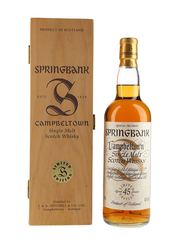 A limited edition bottle of Springbank 45 Year Old Campbeltown Single Malt Scotch Whisky. This was bottled at natural cask strength and released in September 2000 as the fifth expression in the Millennium series.