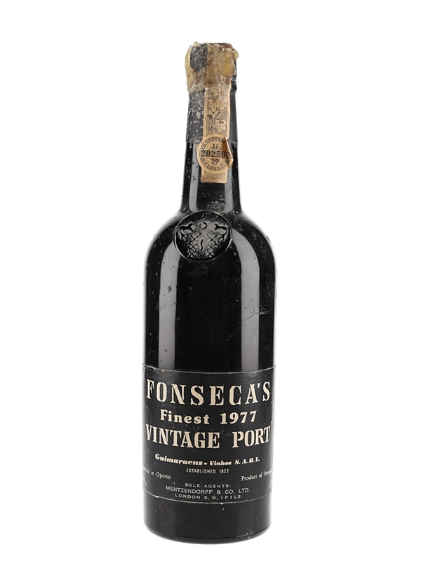 A bottle of Fonseca's Finest 1977 Vintage Port, bottled for sole agents Mentzendorff & Co. Fonseca's wines have been made by five generations of the same family since its establishment in 1822.