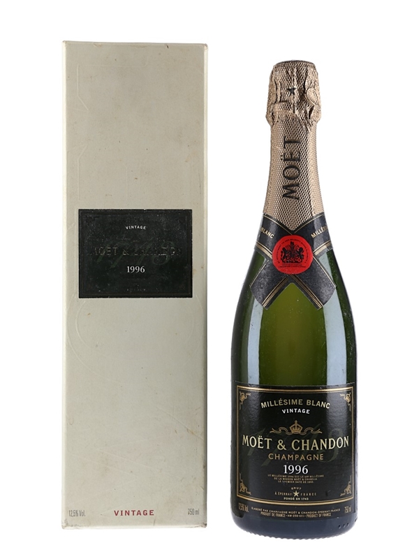 A bottle of Moët & Chandon 1996 Millésime Blanc Vintage Champagne, a blend of 50% Pinot Noir, 5% Pinot Meunier and 45% Chardonnay, harvested between September 16th and October 1st.