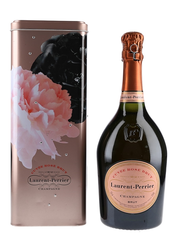 A bottle of Laurent Perrier Cuvée Rosé Brut Non Vintage Champagne in a presentation tin.