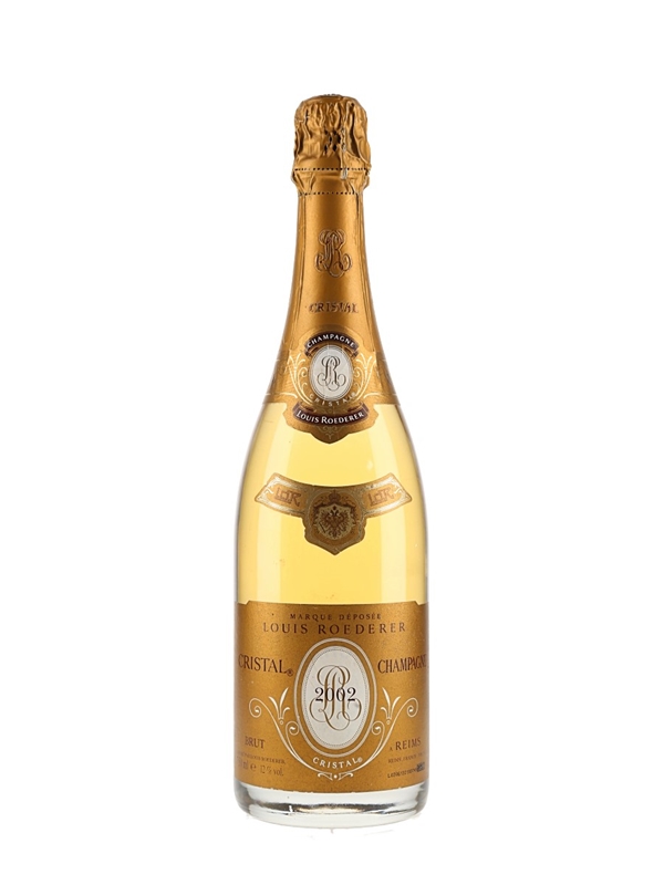 A bottle of Louis Roederer Cristal from the 2002 vintage, presented in a limited edition box.