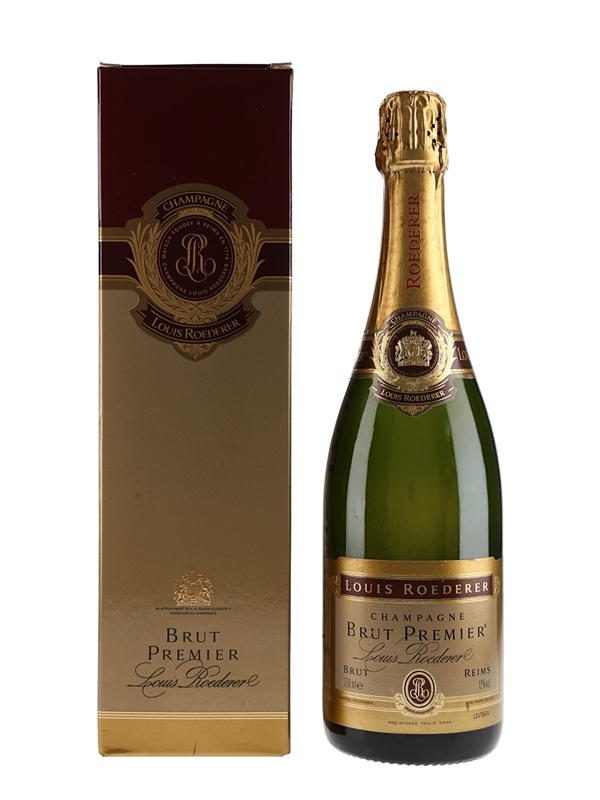 A bottle of Louis Roederer Brut Premier NV Champagne, a blend of 40% Chardonnay, 40% Pinot Noir and 20% Pinot Meunier.
