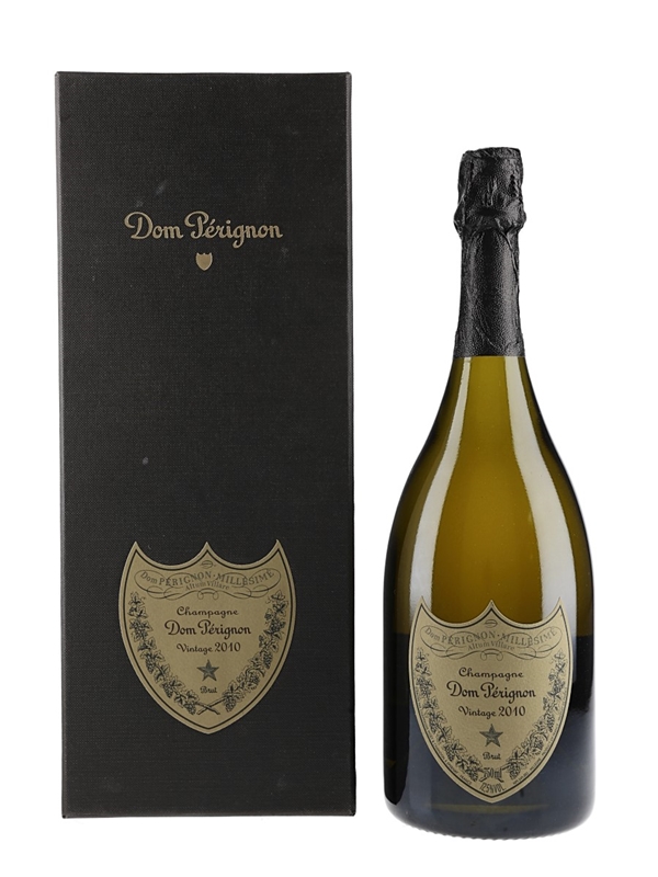 A bottle of 2010 Dom Pérignon vintage Champagne, a blend of 54% Chardonnay, 46% Pinot Noir.