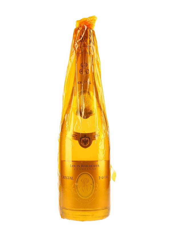 A bottle of Louis Roederer Cristal from the 2014 vintage. A blend of 60% Pinot Noir and 40% Chardonnay.