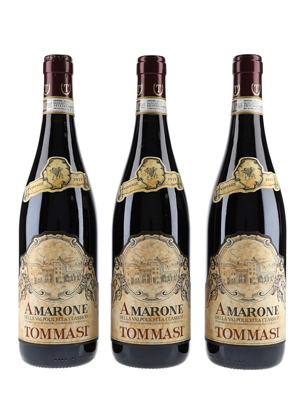 This lot contains three bottles of Tommasi 2017 Amarone della Valpolicella Classico, a full-bodied red wine made from Corvina, Corvinone, Rondinella and Oseleta grape varieties which have been partially dried over four months prior to fermentation and maturation in large Slavonian oak barrels.