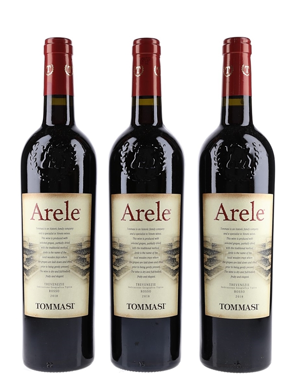 This lot contains three bottles of Tommasi 2018 Arele, a blend of Rondinella, Oseleta and Merlot varieties from vineyards located in Valpolicella Classico which undergo 'parziale appassimento' or partial drying prior to fermentation for added concentration.