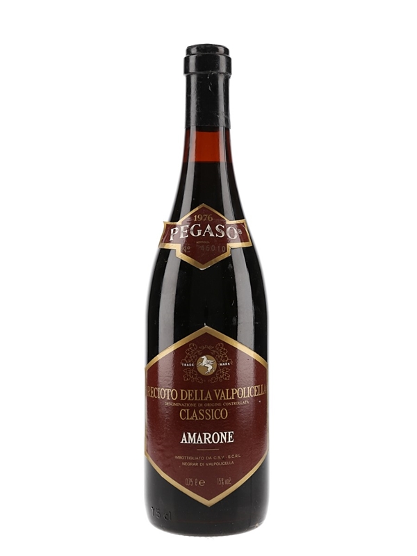 A bottle of 1976 Recioto Della Valpolicella Amarone Classico produced in in the Veneto by Pegaso. This is a full-bodied red wine made from partially dried Corvina, Rondinella and Molinara grapes.