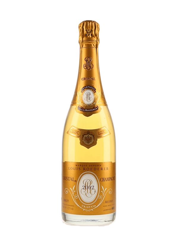A bottle of Louis Roederer Cristal from the 2002 vintage, presented in a limited edition box.