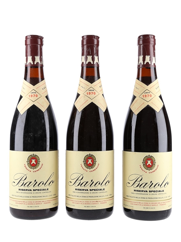 This lot contains three bottles of 1970 Barolo Riserva Speciale from Tenuta Cerequio in La Morra.