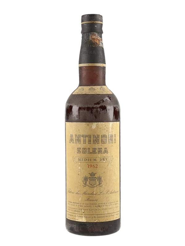 A bottle of 1962 Antinori Solera, a Medium Dry fortified wine produced in Tuscany and bottled in San Casciano by Marchesi Antinori.