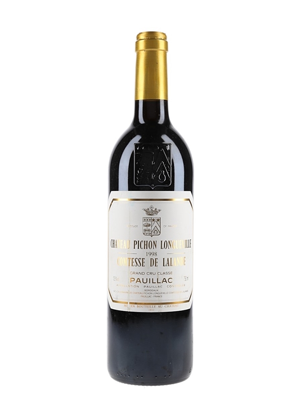 This lot contains a bottle of 1998 Château Pichon Longueville Comtesse de Lalande, a 'Super Second' growth from Bordeaux's Pauillac appellation.