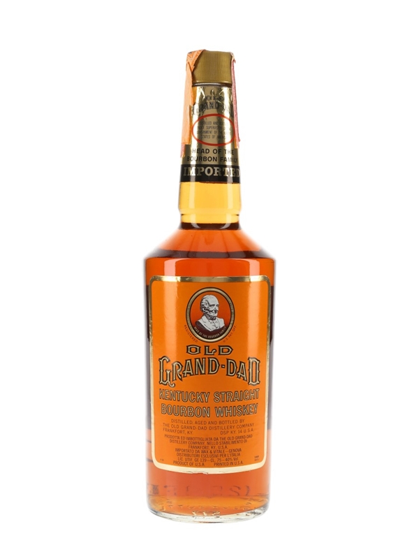 A bottle of Old Grand-Dad Kentucky Straight Bourbon Whiskey, produced by The Old Grand-Dad Distillery Company and imported to Italy by Wax & Vitale.
