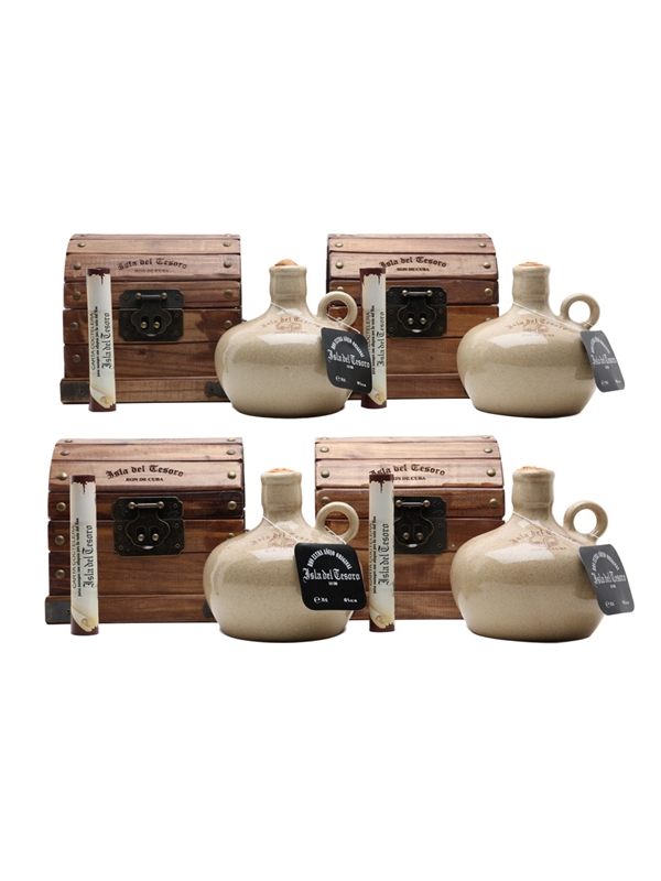 This case contains four ceramic jugs of Isla del Tesoro Extra Añejo rum from Santiago de Cuba. Isla del Tesoro Extra Añejo is a blended rum aged for a minimum of 20 years, and each jug is presented in a wooden treasure chest and a hessian bag.