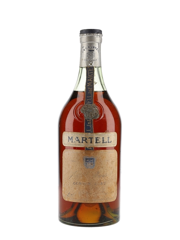 A bottle of Martell Cordon Bleu Cognac, sealed with a spring cap closure. We estimate this was bottled in the 1950s.