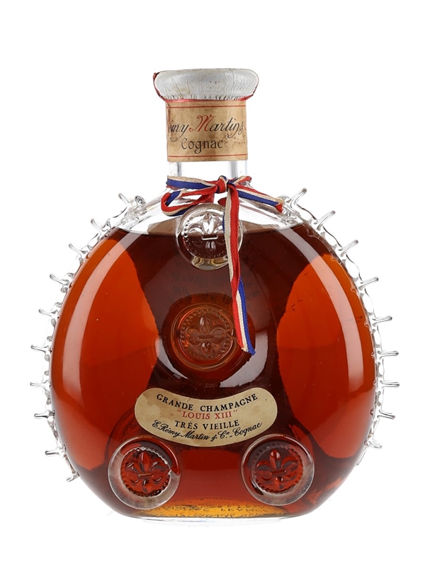A bottle of Rémy Martin Louis XIII Très Vieille Grande Champagne Cognac. This is composed of Grande Champagne eaux-de-vie aged between 40 and 100 years and is presented in a Baccarat crystal decanter. We estimate this was bottled in the 1970s.