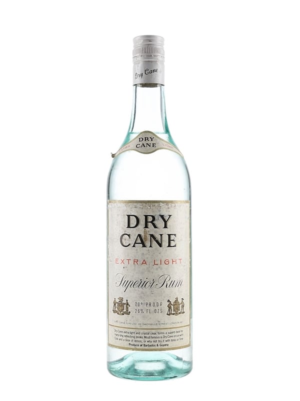 A bottle of Dry Cane Extra Light Superior White Rum. This was produced in Barbados and Guyana, we estimate in the 1970s.