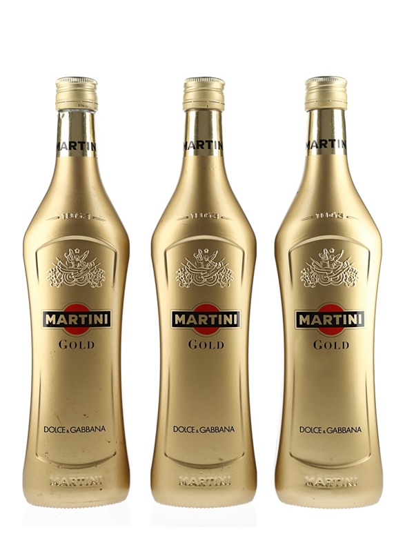 This lot contains three limited edition bottles of Martini Gold, created in partnership with Italian fashion house Dolce & Gabbana. This vermouth is flavoured with herbs and spices, including saffron from Spain, myrrh from Ethiopia, and ginger from India.
