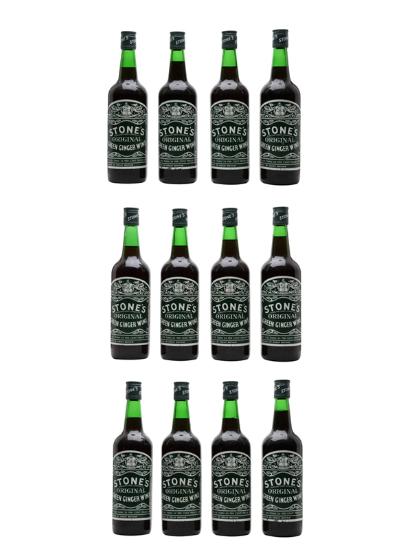 This lot contains 12 bottles of Stone's Original Green Ginger Wine, a fortified wine made with ground ginger and raisins, first produced in England in the 18th century. We estimate these were bottled in the 1970s.
