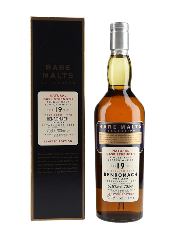 A bottle of Benromach 19 Year Old Single Malt Scotch Whisky. This was distilled in 1978 and bottled in May 1998 for Diageo's Rare Malts Selection range.