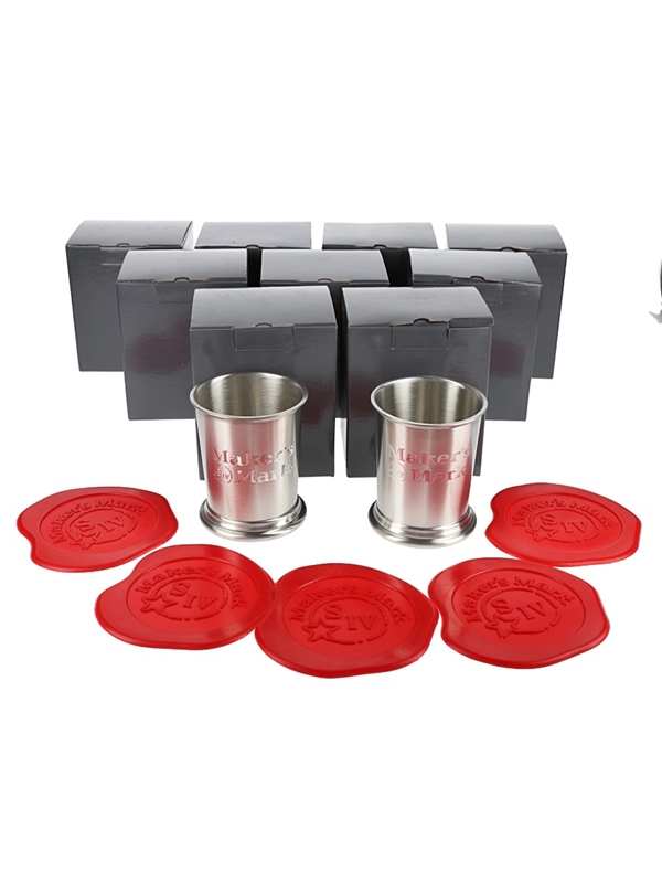 This lot contains a set of nine Maker's Mark mint julep cups made and five coasters. One cup approximately measures 9.5cm x 7.5 One coaster approximately measures 11.5 wide.