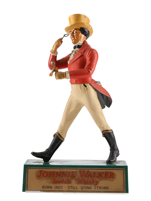 A Johnnie Walker Striding Man figure, made of plastic. This is approximately 21cm tall, with the base measuring 12.5cm x 5cm.