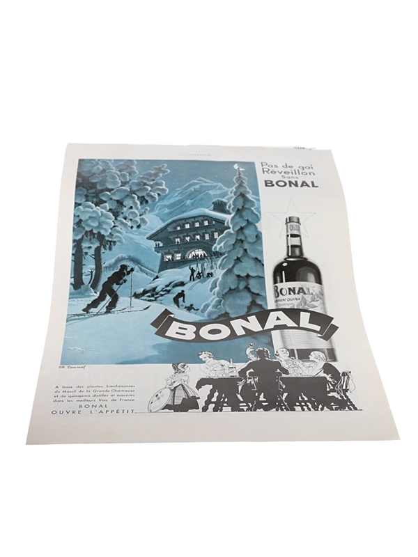 An advertising print for Bonal Aperitif from a 1937 issue of French weekly newspaper L'Illustration, measuring approximately 29cm x 38cm.