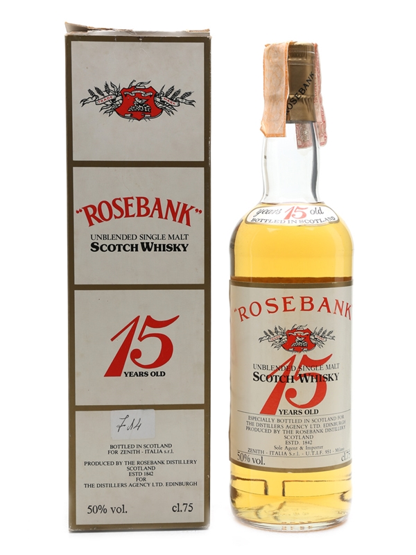 A bottle of Rosebank 15 Year Old, bottled at 50% ABV by the distillery before it closed in 1993. This was imported for the italian market by Zenith, we estimate in the 1980s.