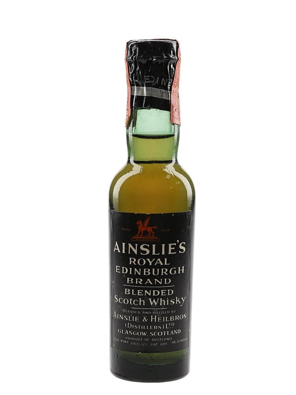 A miniature bottle of Ainslie's Royal Edinburgh Brand Blended Scotch Whisky, produced by Ainslie & Heilbron Ltd. and imported to the US by Hulse Import Co., sole distributors for Western USA, Alaska and Hawaii. We estimate this was bottled in the 1940s to 1950s.