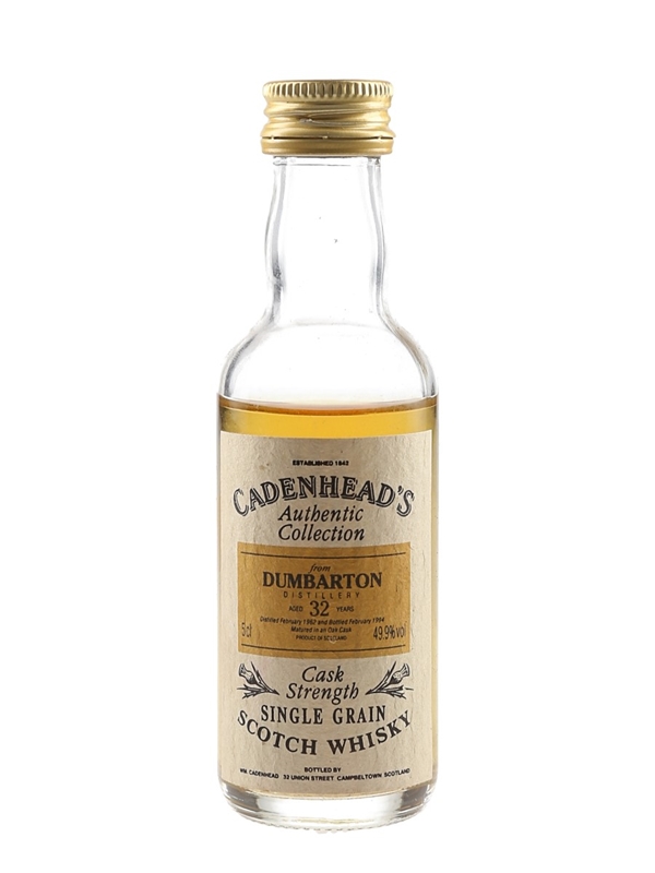 A miniature bottle of Dumbarton 32 Year Old Single Grain Scotch Whisky. This was distilled in February 1962, and bottled in February 1994 by Cadenhead's for the Authentic Collection range.