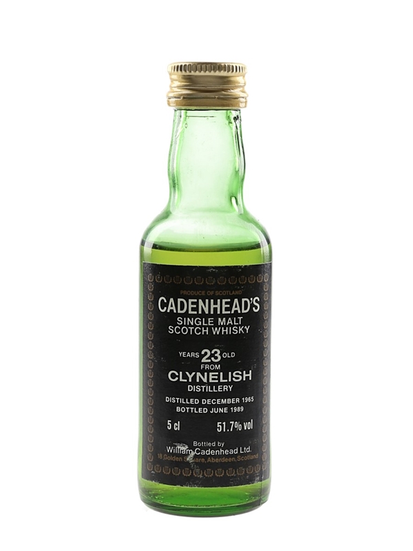 A miniature bottle of Clynelish 23 Year Old Single Malt Scotch Whisky. This was distilled in December 1965, at the distillery now known as Brora, and bottled in June 1989 by Cadenhead's.
