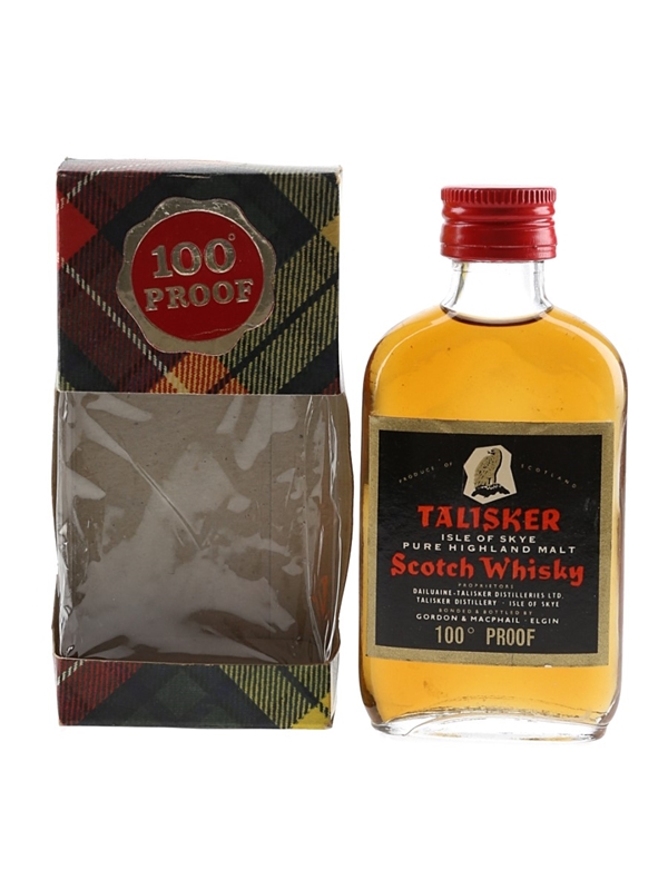 A miniature bottle of Talisker 100 Proof Isle Of Skye Pure Highland Malt Scotch Whisky with the black label, gold eagle design. This was bonded and bottled by Gordon & MacPhail, we estimate in the 1970s.